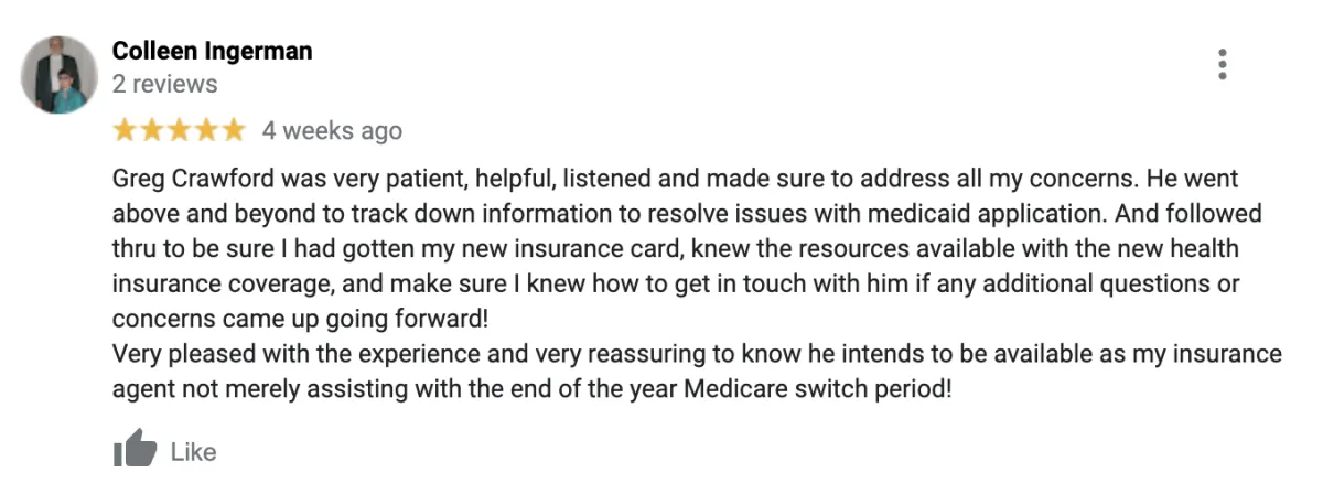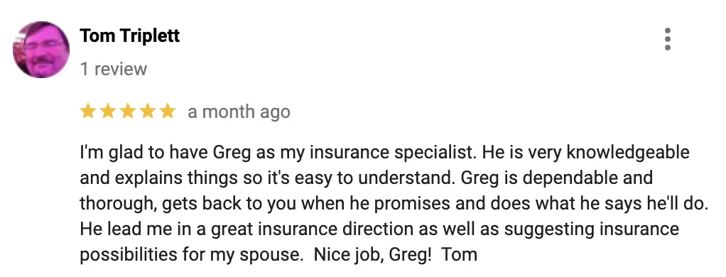 Every year I'm confused about all the commercials and mailings I get about how Medicare has changed or I might be missing out on special benefits...Well, as soon as I met Greg he cleared all of that up for me and made sure I had the exact plan that fits my need. Now I don't have to worry.